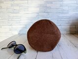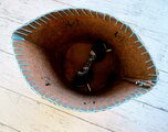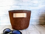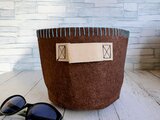 部屋が明るくなる、フェルトの小物入れです。茶色のフェルトに水色の手縫いの刺繍、持ち手はベージュと心地よい色の組み合わせに仕上げました。
