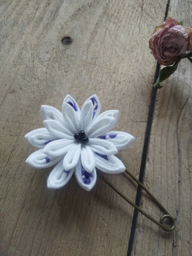つまみ細工のお花のストールピン パープル(黒ビーズ)