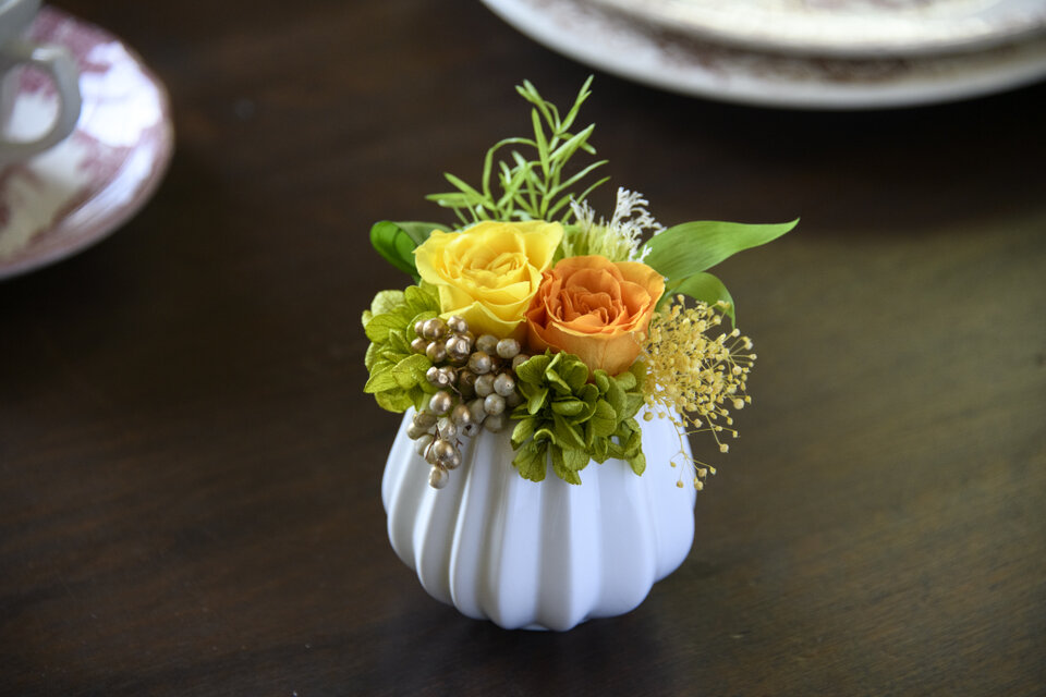 プリザーブドフラワー オレンジ イエロー 黄色 花 アレンジメント ミニ プレゼント 女性 バラ 誕生日 ギフト 花 おしゃれ フェミニン 枯れない お花 お祝い 御礼 お礼 ご挨拶 退職祝い 送別会 結婚祝い 結婚記念日 開店祝い 成約記念 百寿 古希 喜寿 還暦 傘寿 米寿 ブリザードフラワー 陶器 仏花 お悔やみ お供え