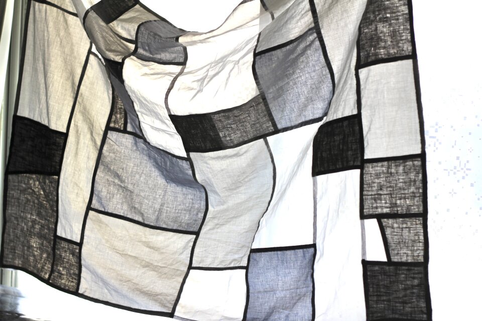 オーガンジー、薄手の綿、厚めリネンのピースを組み合わせています。