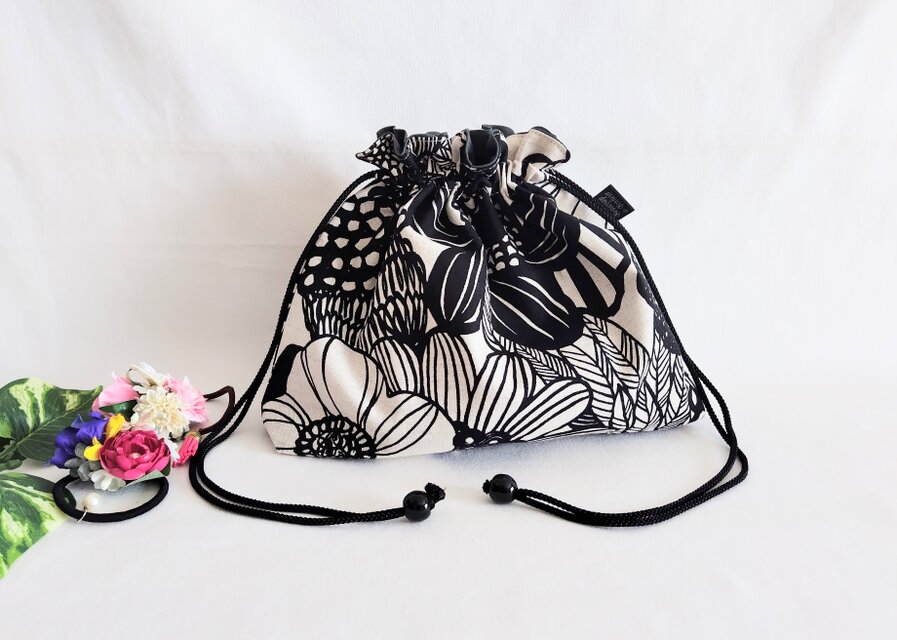 ナチュラル生成り地に北欧風大きな花柄綿100%綿キャンパス地のちょっと大き目サイズの巾着袋です。