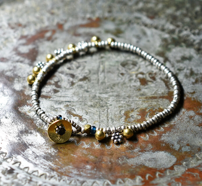 シャン族oldシルバーとカレンシルバー、まん丸インドブラス&インドシルバー小花、oldオリッサブラス、インディゴブルービーズを繋いだブレスです。