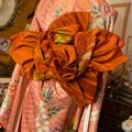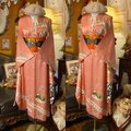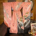【 振袖 着物 ロングワンピース ドレス 2部式ローズ/バラ作り帯 リメイク 洗える 化繊 和洋折衷 ハンドメイド レトロ 古着 麗しのサーモンピンク・おしどりの契り FKW-42】