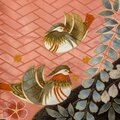 肌馴染みの良い優しいサーモンピンクの地に、仲睦まじい「おしどり」と藤の花が描かれた、多幸感溢れる。すぎない大人の可愛らしさと、振袖由来の気品を兼ね備えた、特別な日のための守護ドレスです。