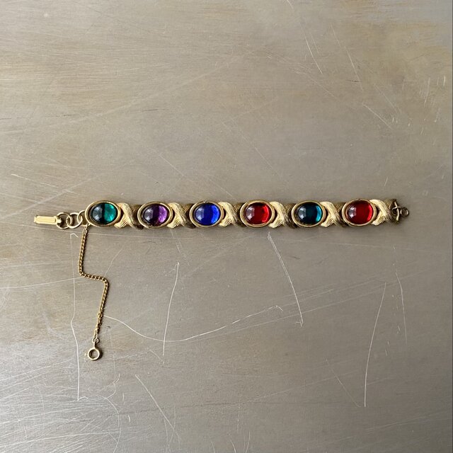 クラシカルな雰囲気のUSAヴィンテージブレスレット。カラフルなビジューが輝く華やかなデザイン。揺らめくセーフティーチェーンもお洒落なポイント。重厚感のあるしっかりとした作りで大人の古着スタイルにもおすすめです。