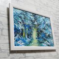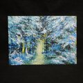 本作品では、ホルベインの油絵具を使用し、荒々しいタッチで描かれた木々の枝には、ふんだんに積もった雪の重みが伝わります。特に目を引くのは、森の奥へと続く暖かい小道です。この小道は暖色系の黄色や黄緑色で描かれ、冷たい森の中で唯一の光を放っています。この光が、鑑賞者を作品の世界へと引き込み、希望や物語性を生み出しています。