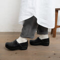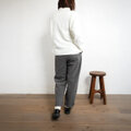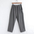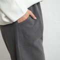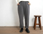 ウエストはゴム仕様でやさしくフィットし、太ももから裾まで程よいゆとりがあり、全体にすっきりとした印象です。