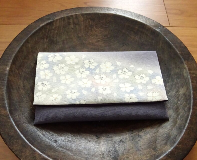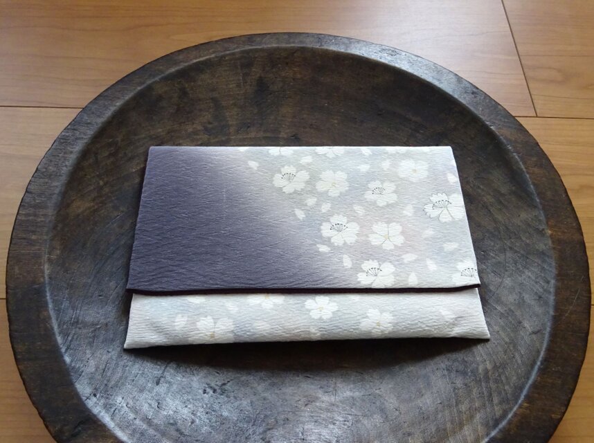 ぼかし染めの中に桜をあしらった素敵な長着から仕立てたお懐紙入れです。