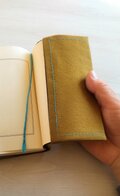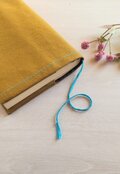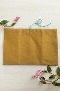 表地は、しっかりとした帆布で辛子色です。裏地と同じビビットなブルーの糸で刺し子をしています。