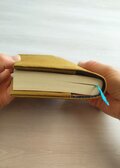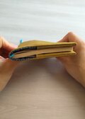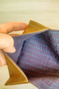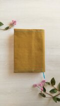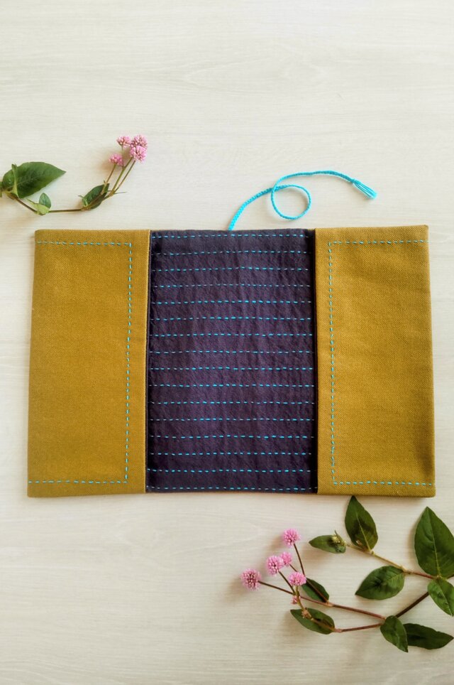 裏地は黒に近い紫色で、ビビットなブルーの糸で刺し子をしています。シンプルなノート柄にしました