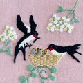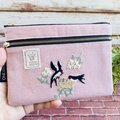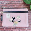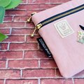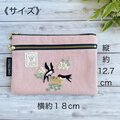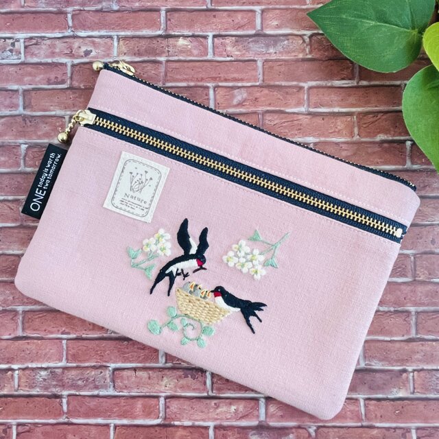 春らしい柔らかなピンク色の生地に、ツバメファミリーを刺繍したフラットタイプのWファスナーポーチです。