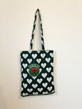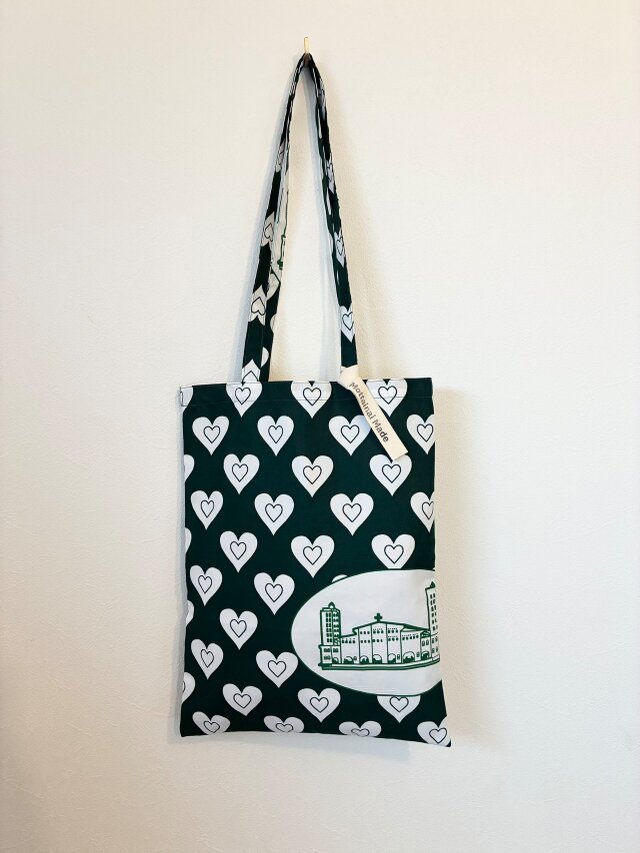 大胆なハートパターンに、エンブレムモチーフが映えるアフリカンファブリックのトートバッグ(S)。