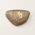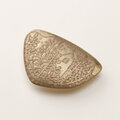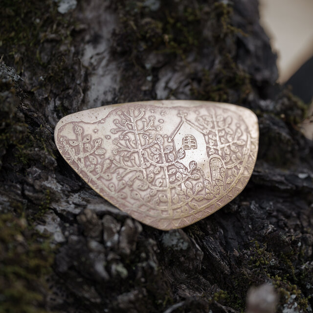 真鍮の塊に銅版画の技法でほどこした凹凸のあるデザインが特徴です。