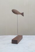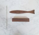 製品はステンレス棒から取り外した状態でのお届けになります。ステンレス棒を魚、台の穴に軽く差し込んでその後力を加えてください。最初から力を加えて差し込もうとしますと、ステンレス棒が穴からずれて製品を傷つけたり、手を傷つける恐れが有ります。ご注意ください。