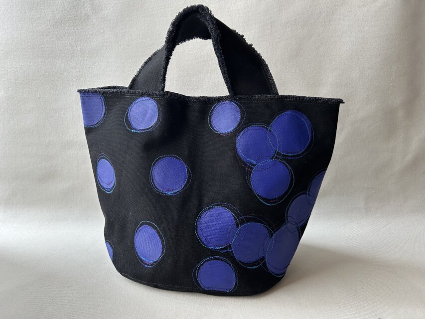 *染めた帆布に、布用絵具でペイント、ミシンでステッチしています。
