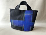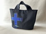 *黒地の厚い帆布に、布用絵具でペイント、ミシンでステッチしています。