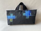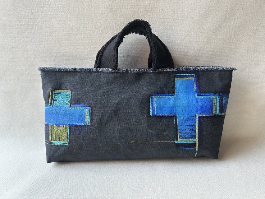 *帆布を染めて、布用絵具でペイントをしてから、ミシンでステッチをしています。