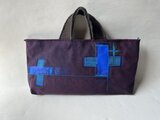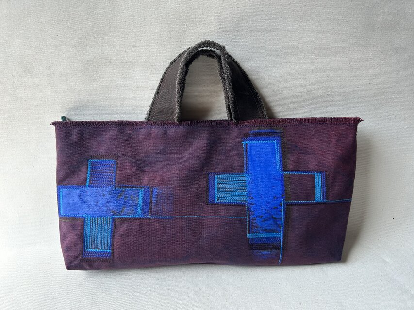 *帆布を染めて、布用絵具でペイントをしてから、ミシンでステッチをしています。