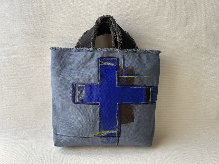 *生成の帆布に布用絵具でペイントをしてから、ミシンでステッチをしています。