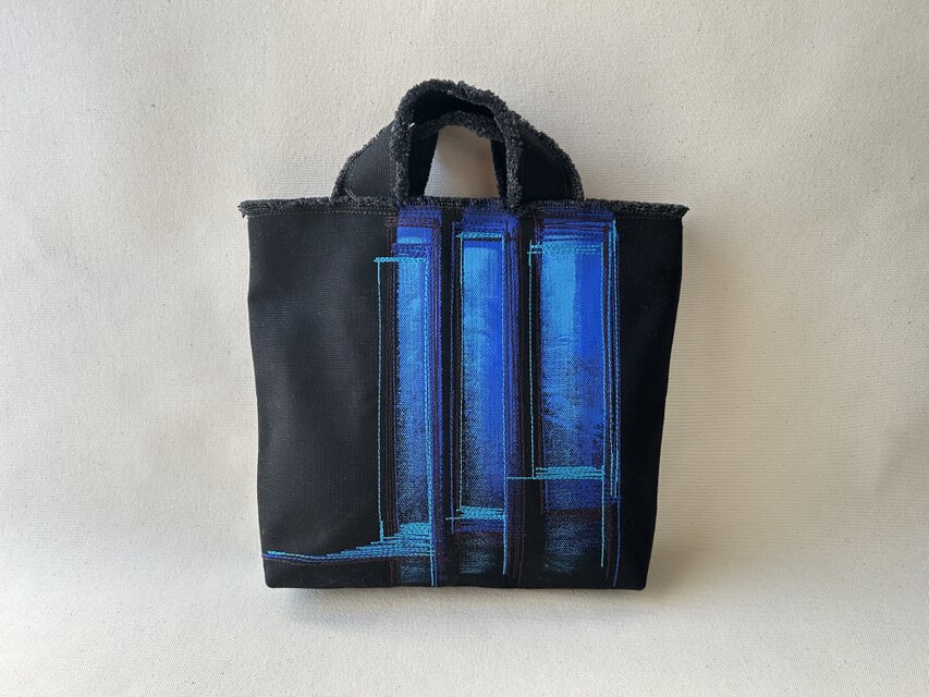 *生成の帆布に布用絵具でペイントをしてから、ミシンでステッチをしています。