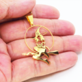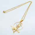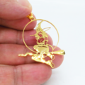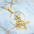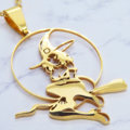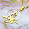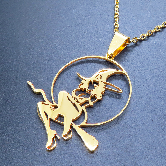 ステンレス製ゴールドカラーのホウキにまたがる魔女のペンダントネックレス ウィッチ ムーン アジャスター追加可
