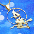 満月を背景にホウキにまたがる魔女のシルエットモチーフのステンレス製ゴールドカラーペンダント・ネックレスです