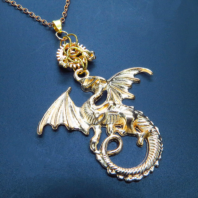 マットゴールド 翼を広げるドラゴンと歯車のロングネックレス ゴシック アジャスター付 長さ調整可