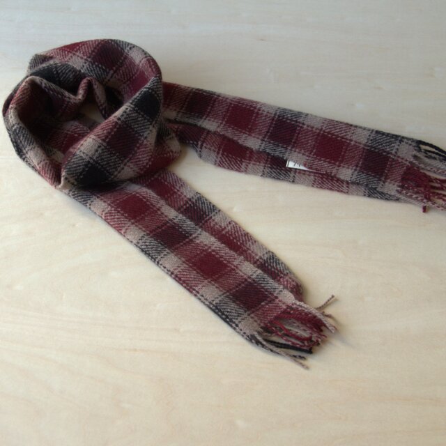 ホームスパン・カシミヤプチマフラー ナチュラルと黒・えんじ色のチェック