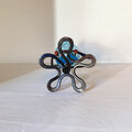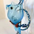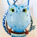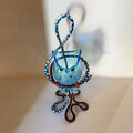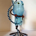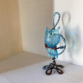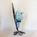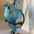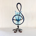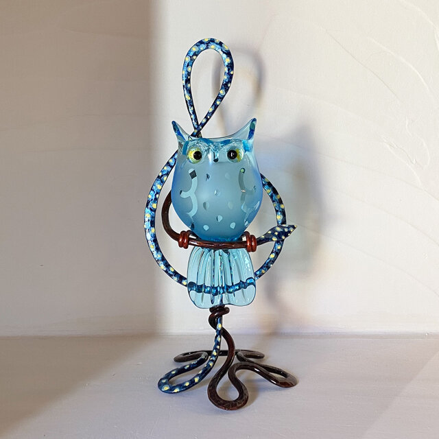 ト音記号のアームベースにガラスのフクロウさんがとまっています。フクロウの目はバーナー細工で製作したオリジナルグラスアイを使っています。細部まで作者の物作りエッセンスが込められた作品です。(ブルーアームはト音記号部のお色がブルー系です)
