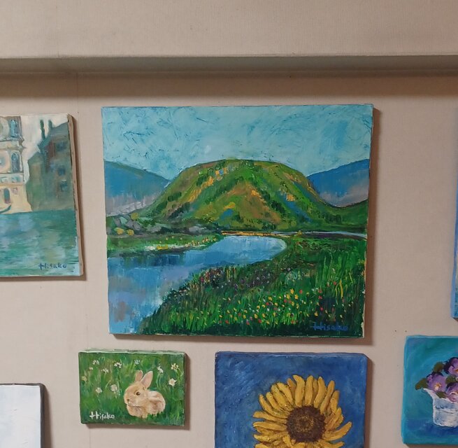 セザンヌのような構図で 春の嵐山を絵描きました。 ブルーと緑が清潔で美しいです。 明るく 穏やかな色で 清涼感に溢れています。タッチは伸びやかです。お部屋に飾って下さい。