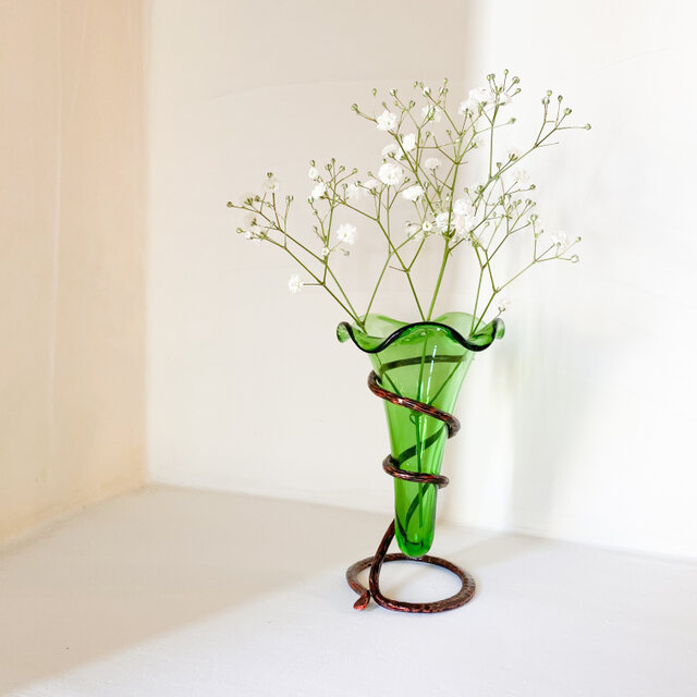 2025年秋の新作です。長いお花も、短いお花も同時に生けることのできるシンプルでエレガントな花器です。打ち出し技法によるハンマーの模様が美しいアームが台座となっています。