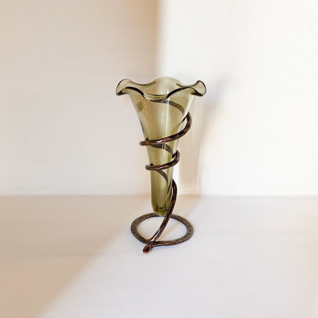 2025年秋の新作です。長いお花も、短いお花も同時に生けることのできるシンプルでエレガントな花器です。打ち出し技法によるハンマーの模様が美しいアームが台座となっています。
