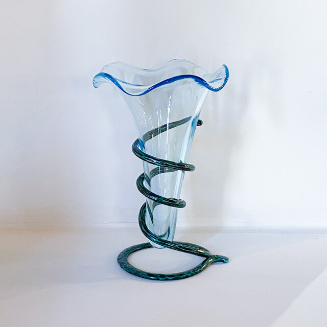2025年秋の新作です。長いお花も、短いお花も同時に生けることのできるシンプルでエレガントな花器です。打ち出し技法によるハンマーの模様が美しいアームが台座となっています。
