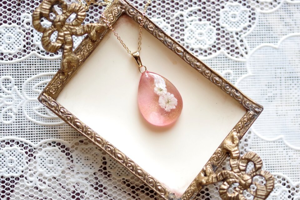 ドロップ型のレジンにお花を二輪咲かせた可憐なペンダントです。