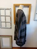 首は丸首で、袖はドルマン袖でゆったりしてますが手首の所でリブで細くなるのでジャケットも通しやすいスッキリとしたデザインで、袖はドルマン袖で肩のラインと袖が一体化のシルエット。着丈は長めのチュニックワンピースタイプ。