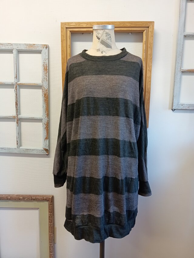 ワイドなボーダー柄のドルマン袖ニットチュニックワンピース。