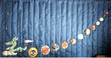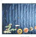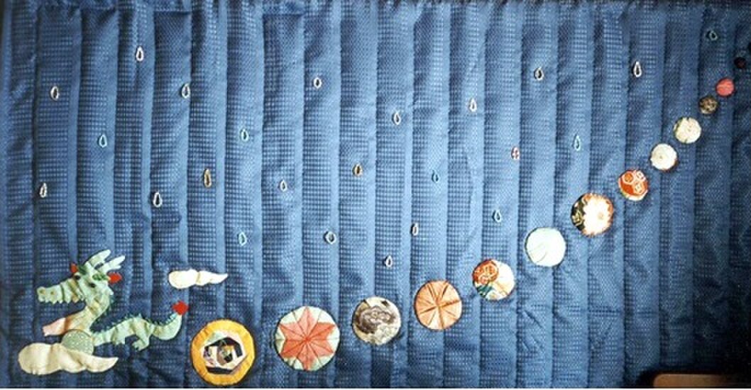To create the illusion of treasures, circular patches of Japanese fabric are used, resembling the precious items. Within these fabric circles, beads are meticulously sewn, adding a touch of sparkle and whimsy to the quilt. The combination of vibrant fabric and delicate beading creates a captivating and enjoyable design.