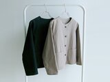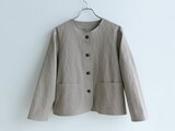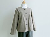 生地の風合いを活かして、コートインにも気軽に着られて、タートルネックセーターやブラウスなど、インナーとのコーディネートもしやすいノーカラー&長袖のシンプルなジャケットに仕立ててみました。
