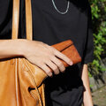 お札のギリギリサイズでは使い勝手が悪くなります。お札が引っかかり、出しにくかったり、ファスナータイプではお札の端が破れたり・・・握りやすく、ミニバックにも収まり、ズボンの後ろポケットにも収まるサイズでありながら「使いやすいコンパクト」を目指しました。スマホサイズの小さい長財布なので、ちょっとコンビニに、ちょっとランチに行く時バッグを持たず、スマホと身軽に。
