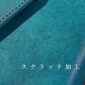 円を描くような傷がたくさんついているのがスクラッチ加工です。この加工で革にビンテージのような印象があり、革の表面は毛羽立ち、手触りはざらっとしています。革自体は少し硬めでしっかりとした革です。お使い頂くほど、毛羽が寝てツヤツヤになっていき、色は濃く変化していきます。かなり早く毛羽が寝ていくので、エイジングを短期間で味わえるのも特徴です。