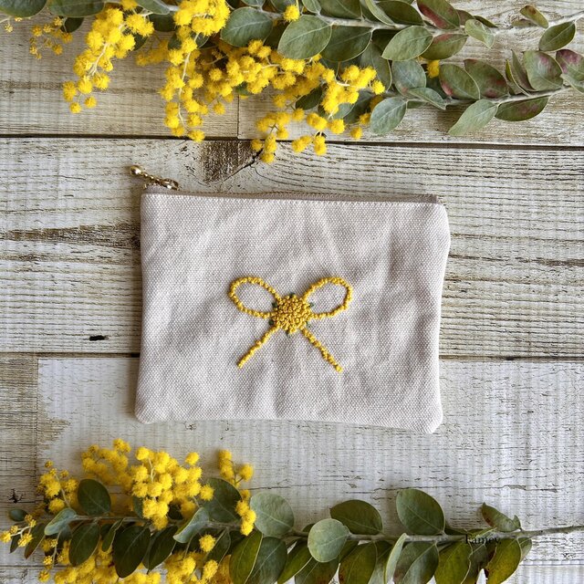 大人かわいい手刺繍ミモザリボンポーチはいかがでしょうか?