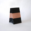 バッグ制作の過程で生まれた布を組み合わせ、紙袋のような小さなふくろをつくりました。ロウを引くことで、撥水性と耐久性が加わり、ながくお使いいただける素材になっています。はじめは紙のようにハリのある手触りですが、使い込むほどに柔らかくなり、折れシワや色の深まりとともに、少しずつ風合いが育っていきます。