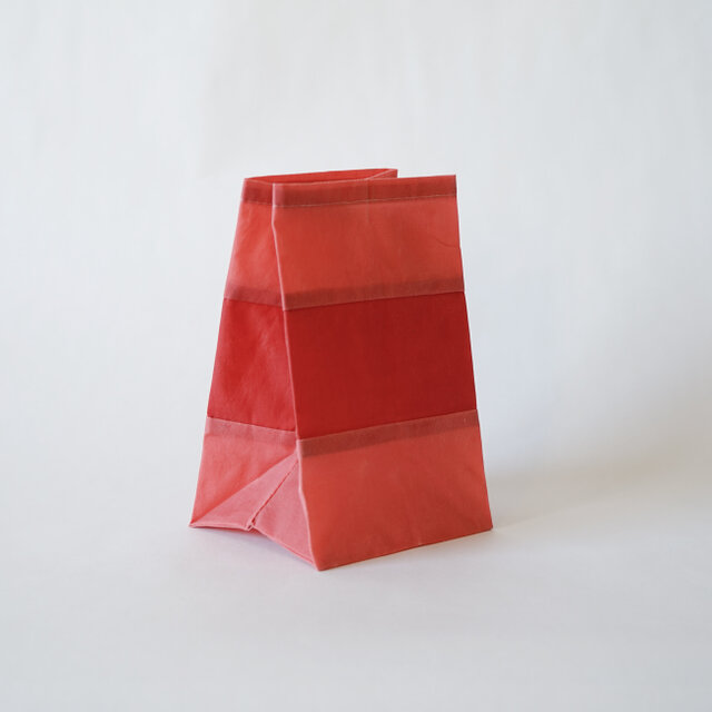 バッグ制作の過程で生まれた布を組み合わせ、紙袋のような小さなふくろをつくりました。ロウを引くことで、撥水性と耐久性が加わり、ながくお使いいただける素材になっています。はじめは紙のようにハリのある手触りですが、使い込むほどに柔らかくなり、折れシワや色の深まりとともに、少しずつ風合いが育っていきます。