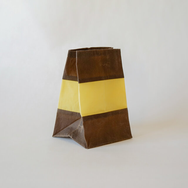 バッグ制作の過程で生まれた布を組み合わせ、紙袋のような小さなふくろをつくりました。ロウを引くことで、撥水性と耐久性が加わり、ながくお使いいただける素材になっています。はじめは紙のようにハリのある手触りですが、使い込むほどに柔らかくなり、折れシワや色の深まりとともに、少しずつ風合いが育っていきます。