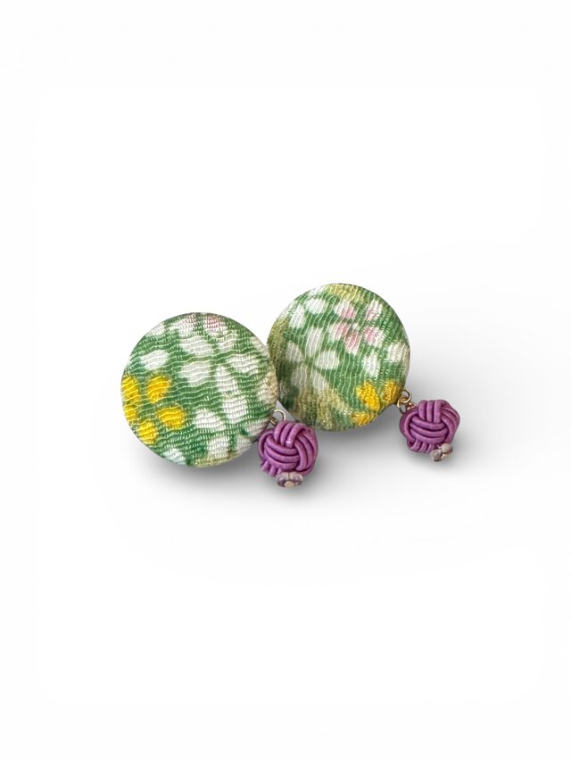 《イヤリング》一越ちりめん・小花の可愛いくるみボタンに水引き玉結びのイヤリング♪
