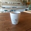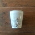 轆轤で制作しチューリップのレリーフを施した上に白化粧土を掛けたタンブラーです。白化粧土のムラは各々違います。