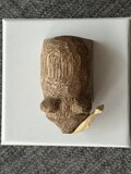 口元にくわえた小さな木彫りの魚が、さりげない遊び心を添えています。