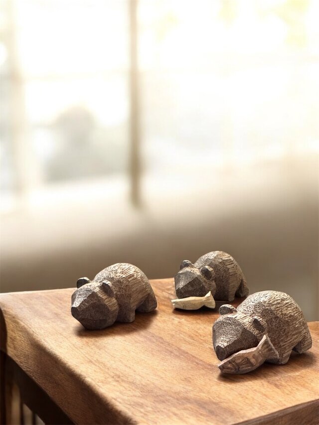 こちらの熊は、機械を使わず一点一点、手作業で彫り上げた木彫り作品。