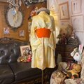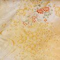 鮮やかなオレンジイエロー(山吹色)の地に、流れるような水紋と四季の花々が描かれたワンピースです。