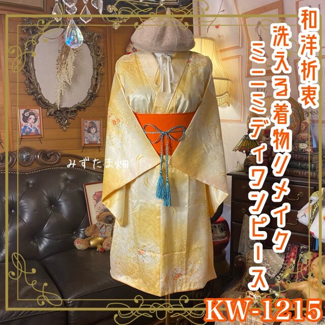 着物リメイク ワンピース ドレス ミニミディ 洗える 化繊 帯 和洋折衷 黄金のオレンジイエロー・流水花文様 KW-1215